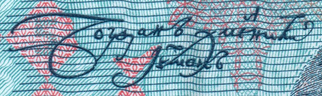Нижче, поверх герба гетьмана – підпис Богдана Хмельницького: «Богдан Хмельницький гетьман» (рис. 5). У верхній лівій частині, на полі водяного знаку, напис «НАЦІОНАЛЬНИЙ БАНК УКРАЇНИ», під яким розміщено підпис факсиміле Голови Національного банку України Валерії Гонтаревої і напис «ГОЛОВА». Праворуч від напису розміщено декоративний елемент із зображенням малого Державного Герба України (рис. 6) – латентне (приховане) зображення цифрового позначення номіналу «5», що видиме під час розглядання банкноти під гострим кутом зору до джерела світла.