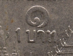 У центральній частині монети, також зі зміщенням праворуч, вказано номінал у два рядки «๑»/«1 บาท» (1 БАТ) (рис. 7).