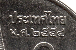 У верхній частині, зі зміщенням праворуч, розміщено напис «ประเทศไทย» (ТАЇЛАНД), а нижче рік карбування монети – «พ.ศ. ๒๕๕๔» (В.Е. 2554 – буддійський календар, 2011 – за Григоріанським календарем) (рис. 6).