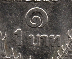 У центральній частині монети, також зі зміщенням праворуч, вказано номінал у два рядки «๑»/«1 บาท» (1 БАТ) (рис. 7).