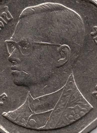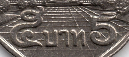 З обох сторін зображення короля пояснювальний напис: ліворуч – «ภูมิพลอดุลยเดช» (ПУМІПОН АДУЛЬЯДЕТ) (рис. 4), праворуч – «รัชกาลที่ ๙» (КОРОЛЬ РАМА IX) (рис. 5).