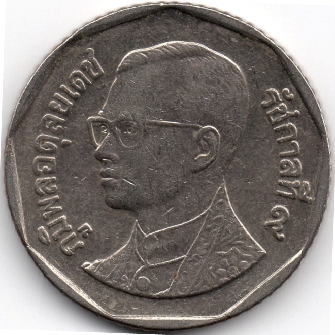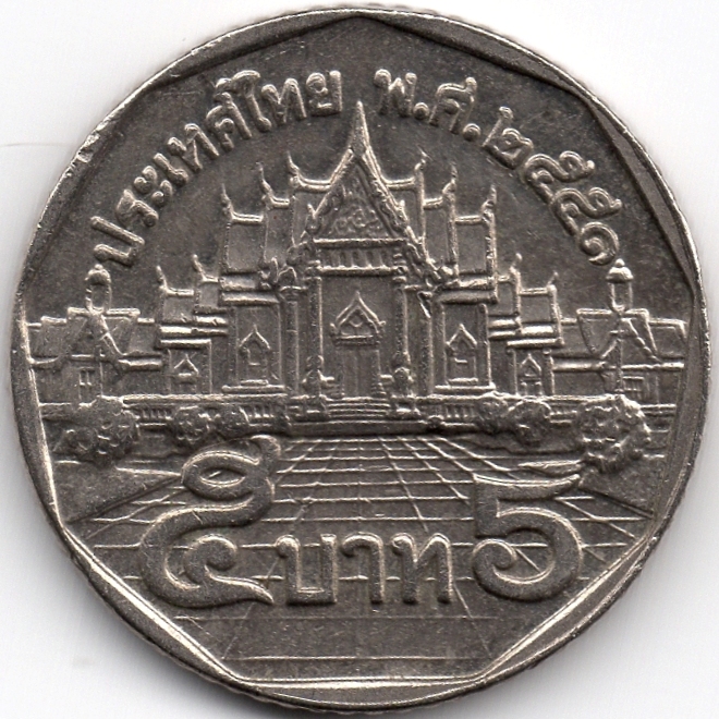 Обігова монета номіналом 5 батів 2008 року викарбувана Королівським монетним двором Таїланду в провінції Патхумтхані, у передмісті Бангкока. Монета у формі кола. Виготовлена із міді з мідно-нікелевим покриттям.